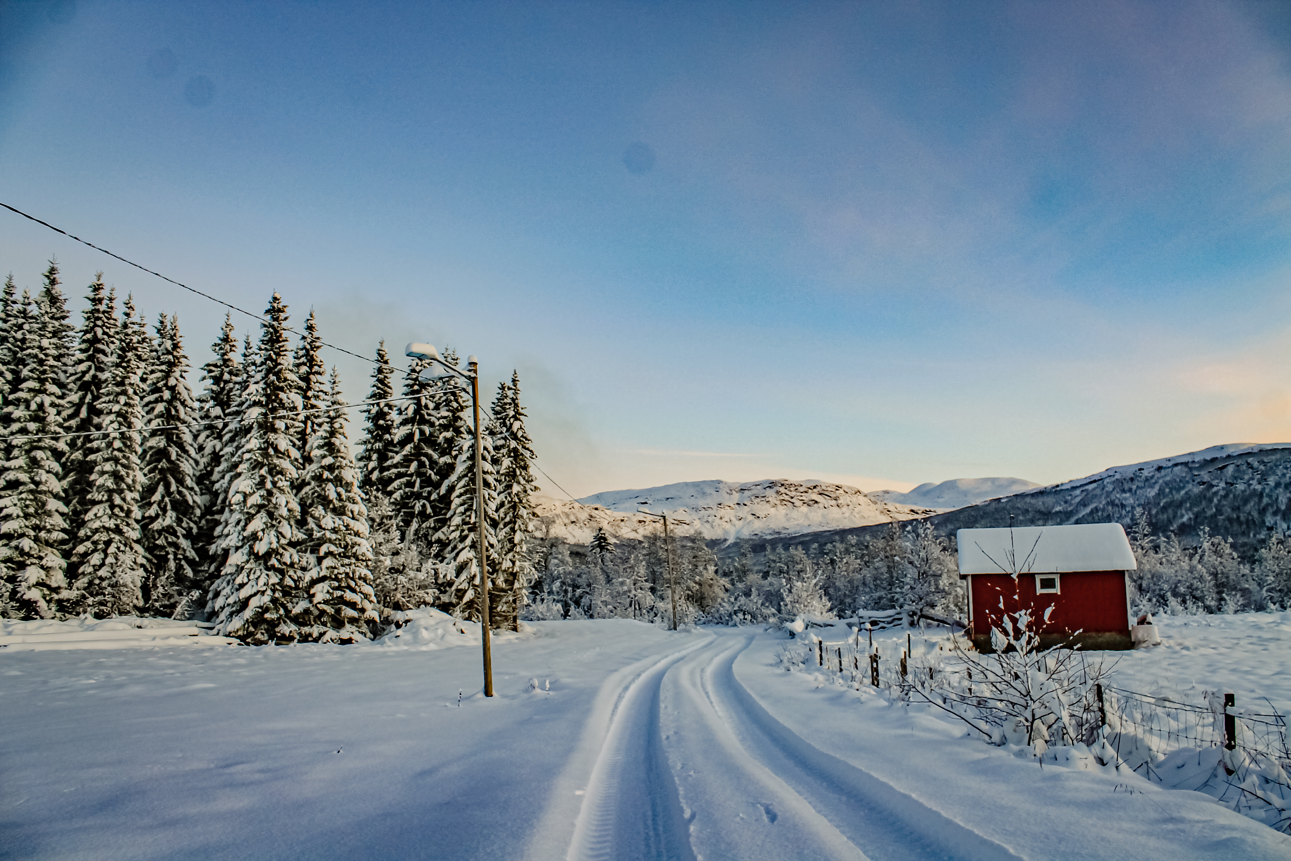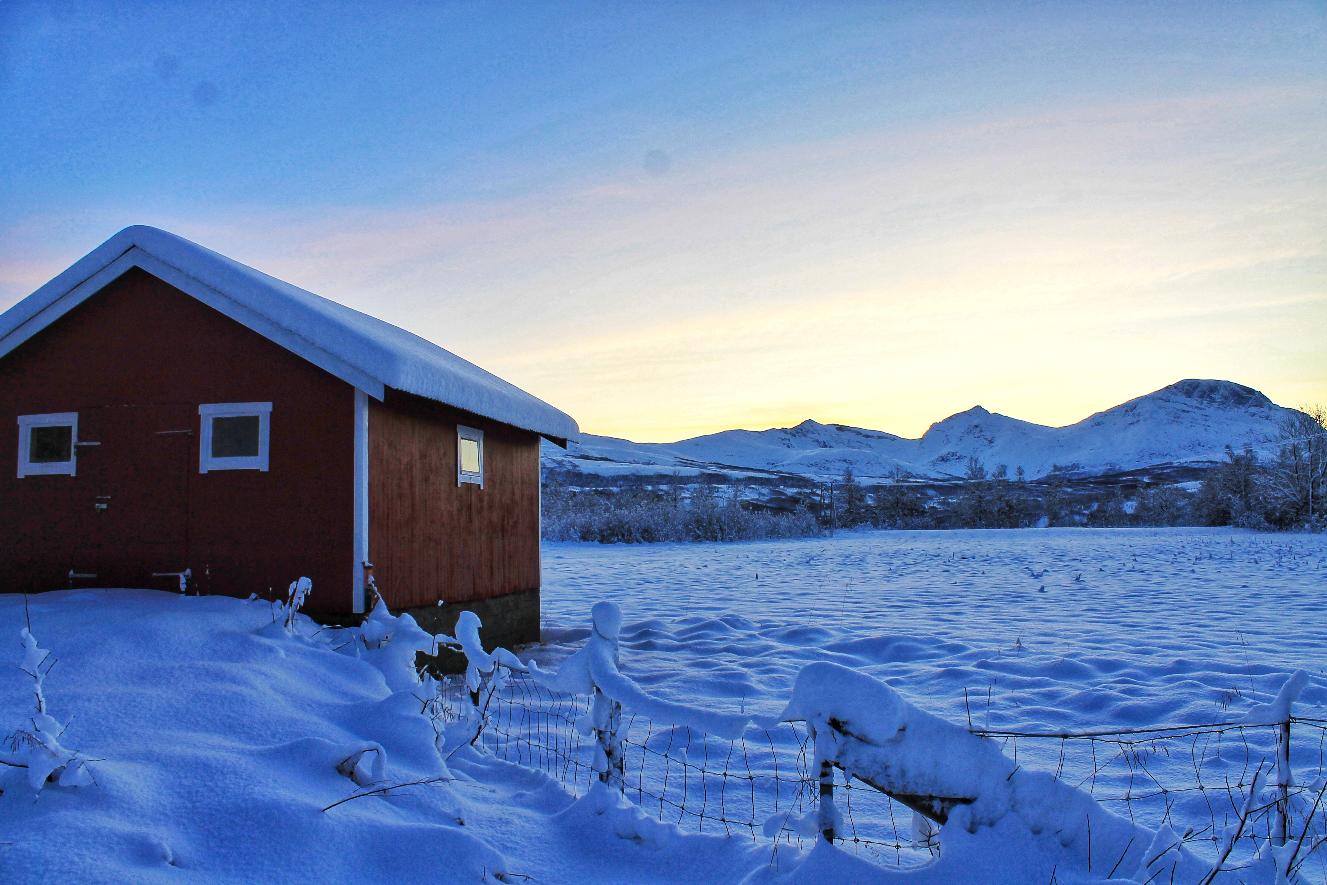 - Välj en plats med en klassisk röd stuga eller lada, gärna omgiven av snötäckta träd eller öppna landskap.